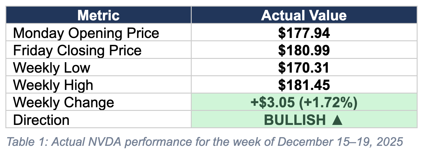 Last week, TheDayAfterAI News conducted an experiment: we asked five leading AI chatbots — Perplexity, Google Gemini, xAI's Grok, OpenAI's ChatGPT, and Anthropic's Claude — to predict NVIDIA Corporation (NASDAQ: NVDA) stock performance for the trading week of December 15–19, 2025. Now that the week has concluded, we can evaluate each AI's accuracy across multiple dimensions.