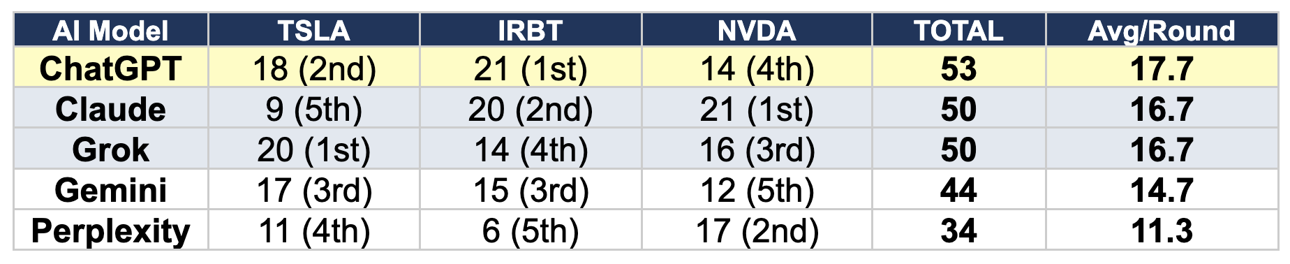 Perplexity started with a middle-of-the-pack 11 points (4th) in Tesla, then suffered a setback in IRBT due to pre-bankruptcy timing (6 pts, 5th). However, it bounced back strongly in NVIDIA with 17 points (2nd place). When given equal access to timely information, Perplexity demonstrates competitive analytical capabilities.