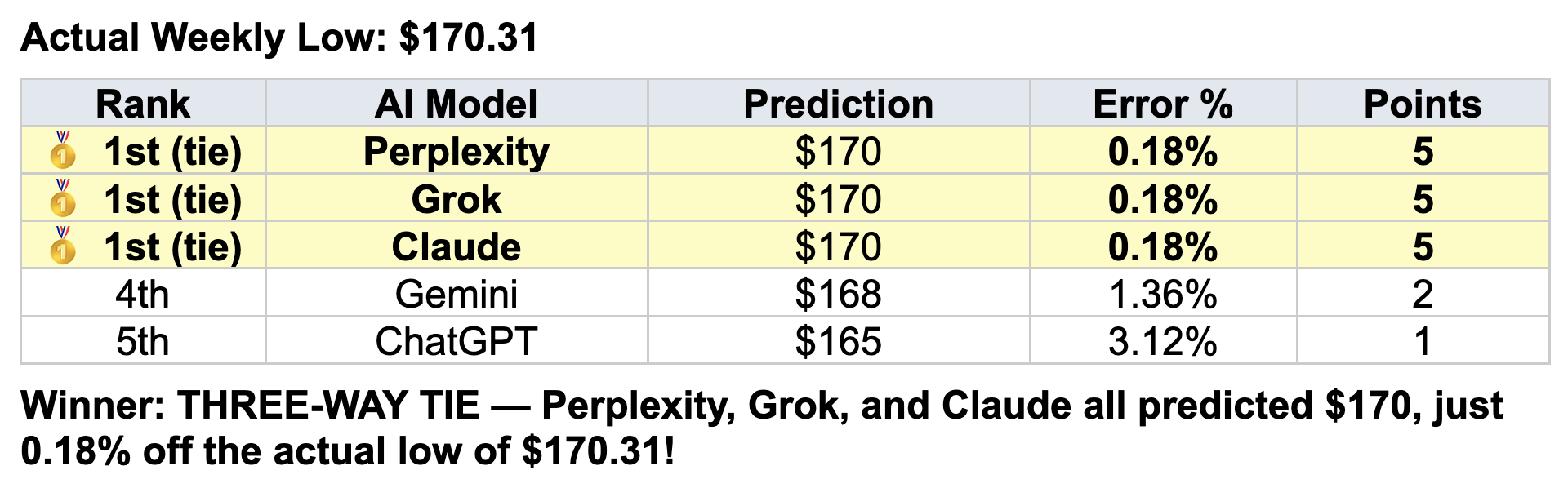 The Floor Prediction Phenomenon: Remarkably, three AI systems—Perplexity, Grok, and Claude—all predicted the same $170 weekly low, coming within just 31 cents (0.18%) of the actual $170.31. This consensus on the support level, which all AIs had identified as "critical" in their original analyses, proved extraordinarily prescient. The $170–$175 support zone mentioned by every chatbot held exactly as predicted.