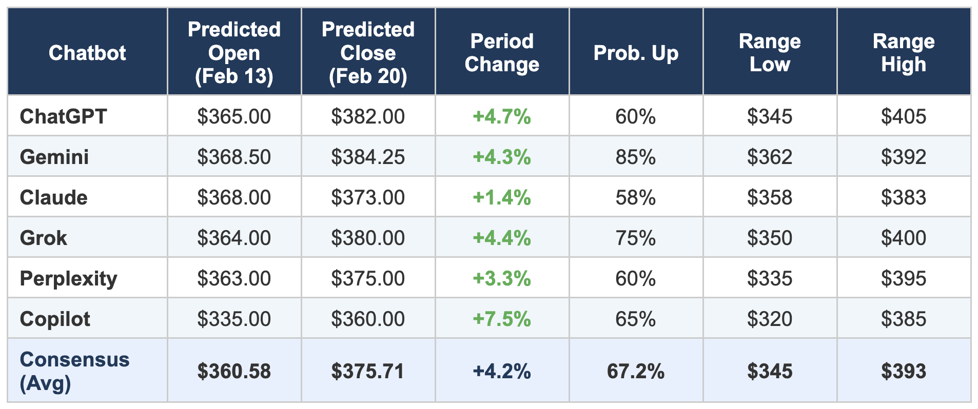 Each chatbot was given identical prompts and access to the same publicly available market data. They were asked to provide a predicted opening price (Feb 13), a predicted closing price (Feb 20), a probability assessment of whether the stock would rise or fall over the period, an estimated price range, and a session-by-session forecast path. The results reveal both a striking degree of consensus and notable divergences in methodology and confidence levels.