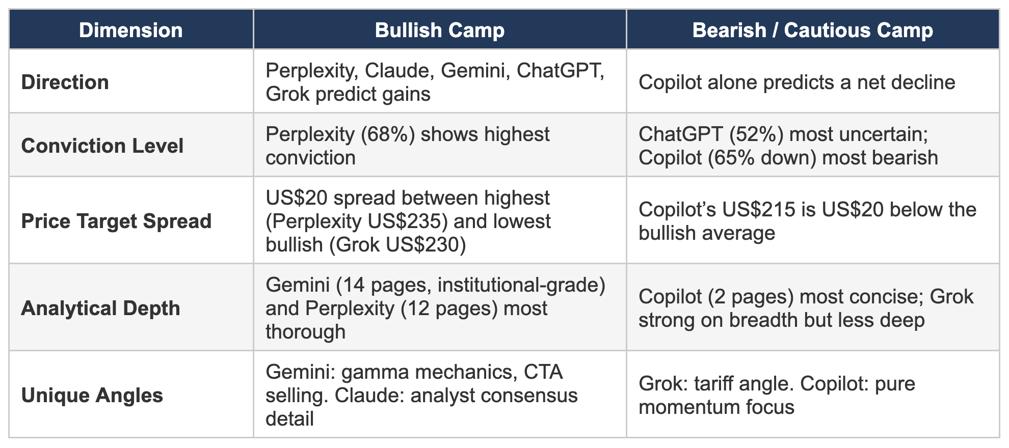 The sentiment analysis was multi-dimensional, incorporating VIX levels, equity put/call ratios, short interest data, social media sentiment from Stocktwits, and key analyst ratings. Grok’s predicted close of US$230 placed it in the middle of the pack, reflecting a cautiously optimistic but not aggressive stance.