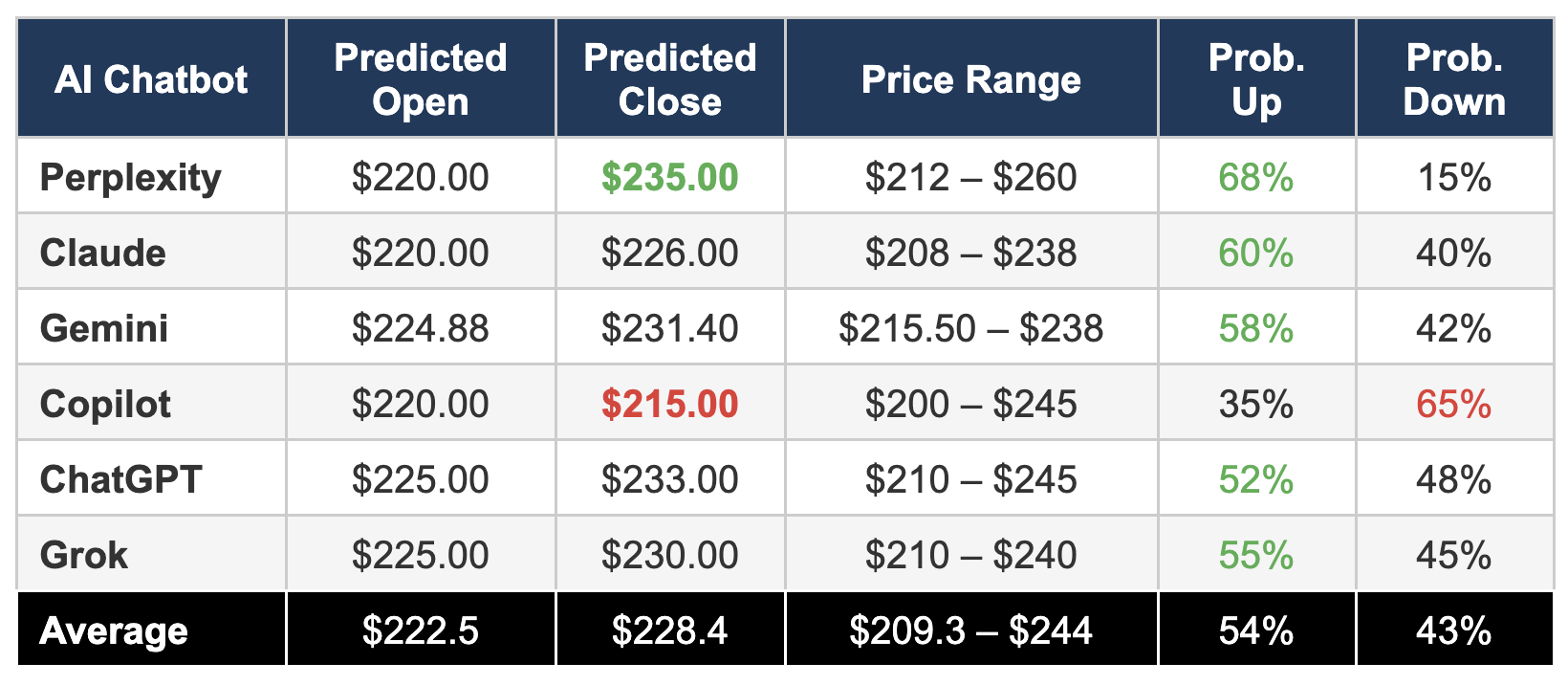 Opening Price Consensus: All six predicted an opening price between US$220 and US$225, reflecting the sharp pre-market decline from the prior close of US$242.11.