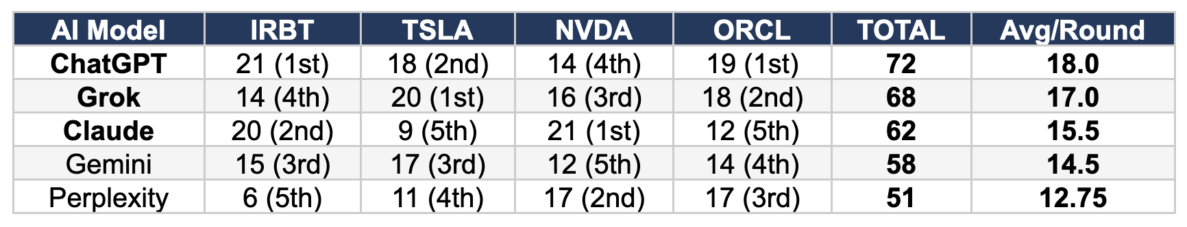 With 72 cumulative points across four rounds, ChatGPT has established itself as the most dependable AI for stock prediction. Its two first-place finishes (IRBT and ORCL) combined with consistent top-half placements demonstrate an analytical framework that adapts well to different market conditions. ChatGPT's strength lies in balanced predictions that avoid extreme positions.