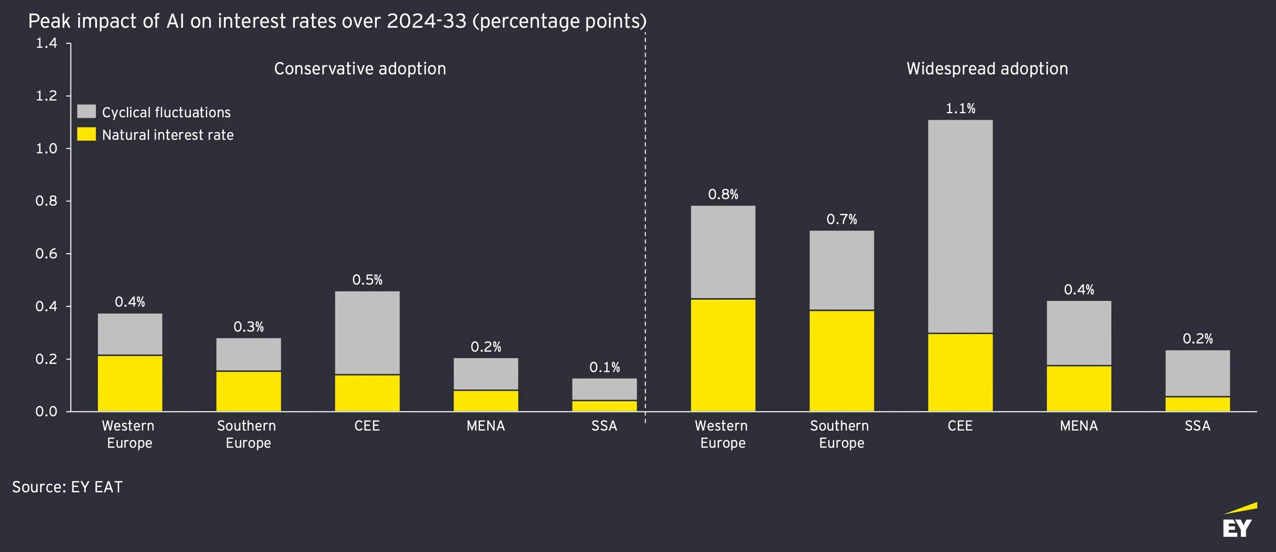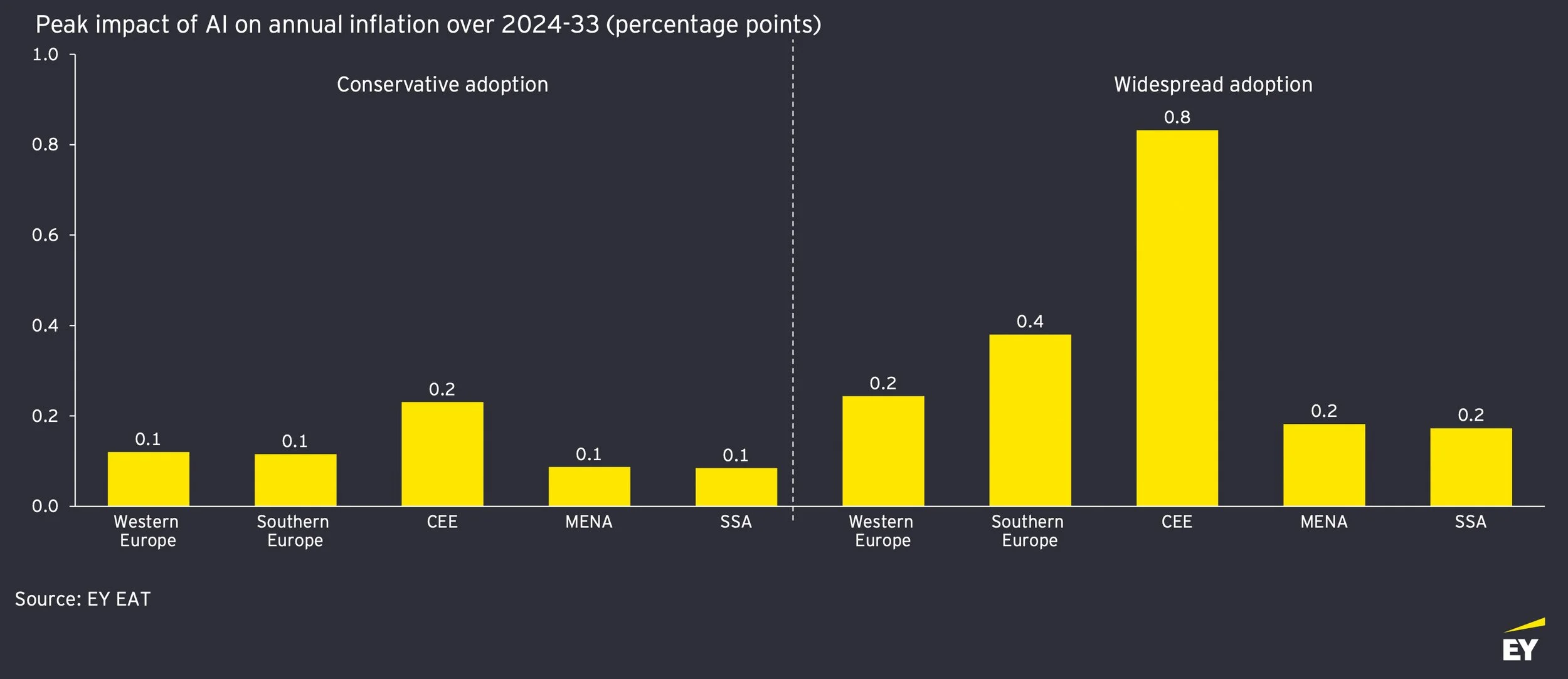 • Inflationary effects of AI adoption are estimated to range from 0.1 to 0.4 percentage points for most regions, peaking at 0.8 in CEE.