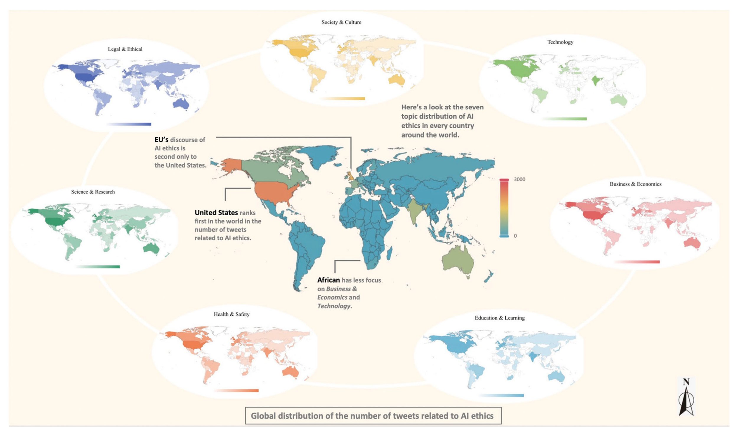 The researchers caution that data from countries with limited Twitter use, such as China and Cuba, may not fully reflect local sentiments. Nonetheless, the global story map illustrates how AI ethics concerns transcend borders, shaped by local contexts and priorities.