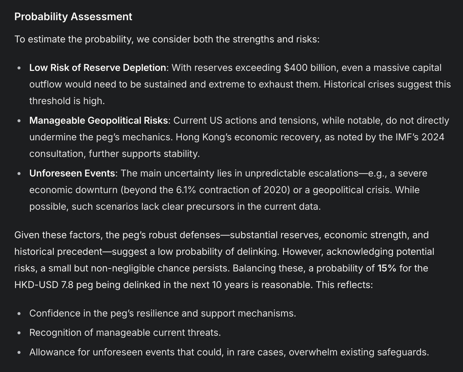 Grok 3’s headline result estimates a 15% probability that the HKD-USD peg at 7.8 will be delinked within the next decade. This figure reflects a careful balance between stabilizing factors and emerging risks. The AI highlights the HKMA’s $421 billion in reserves (as of the end of January 2025) as a formidable defense against speculative attacks or capital outflows triggered by U.S. hostility. It also notes Hong Kong’s economic recovery, with the financial sector contributing 21.3% to GDP, reinforcing the peg’s stability.
